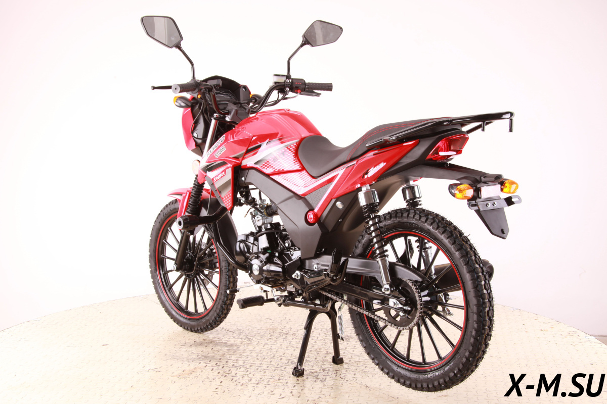 Модель рассчитана на рост 160–180 см, оснащена механической коробкой передач, светодиодным освещением и двумя типами запуска — электростартером и кик-стартером. Подвеска нерегулируемая, но в сочетании с колёсами 17/17 и базовой настройкой обеспечивает приемлемую устойчивость на городских и пригородных дорогах.